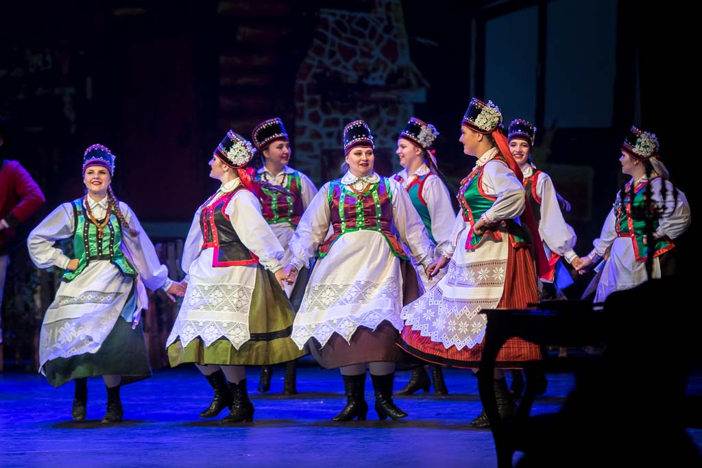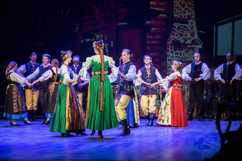 Mężczyzna tańczył poloneza w kontuszu, z nakryciem głowy i szablą u boku, kobiety w sukniach bogatych, gorsetach, kaftanikach obszytych futerkiem.